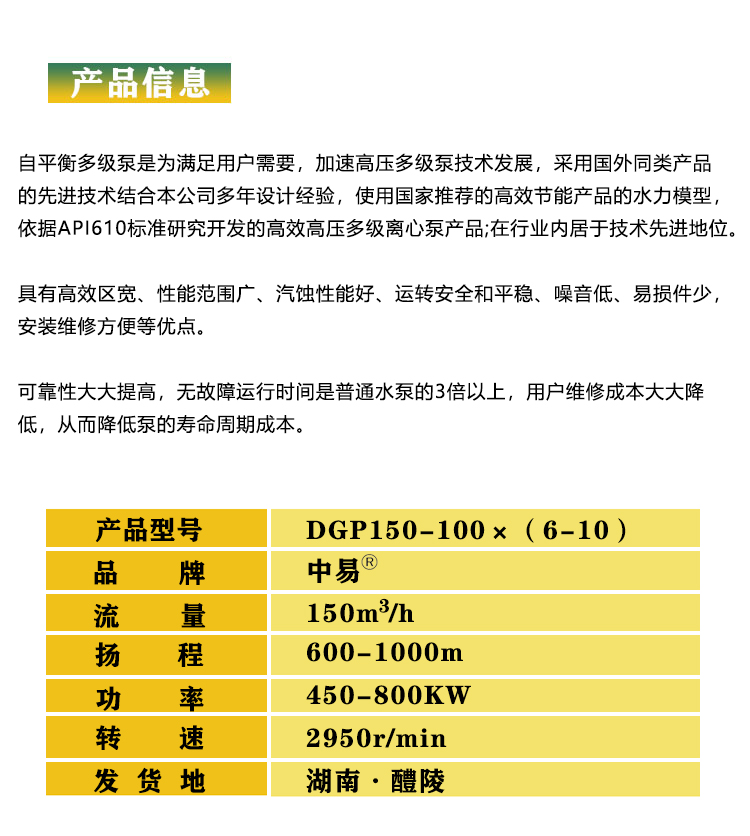 产品简介:产品简介:自平衡多级离心泵: 自平衡多级泵是为满足用户需要,加速高压多级泵技术发展,采用国外同类产品的先进技术结合本公司多年设计经验,使用国家推荐的高效节能产品的水力模型,依据API610标准研究开发的高效高压多级离心泵产品;在行业内居于技术先进地位。