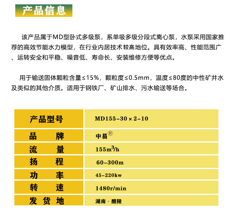 产品简介:MD型多级离心泵: MD型矿用耐磨多级离心泵是一种卧式单吸多级离心泵,采用了国家推荐使用的高效节能产品的水力模型,在行业内居于技术先进地位。具有效率高、性能范围广、运转安全和平稳、噪音低、寿命长:安装维修方便等优点。该类型的矿用多级离心泵是用于供输送固体颗粒含量不大于1.5%的中性矿水(粒度小..