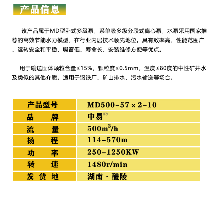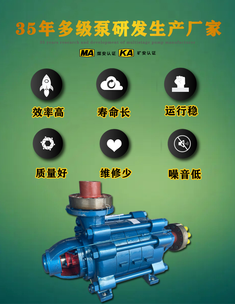 产品简介:MD型多级离心泵: MD型矿用耐磨多级离心泵是一种卧式单吸多级离心泵,采用了国家推荐使用的高效节能产品的水力模型,在行业内居于技术先进地位。具有效率高、性能范围广、运转安全和平稳、噪音低、寿命长:安装维修方便等优点。该类型的矿用多级离心泵是用于供输送固体颗粒含量不大于1.5%的中性矿水。