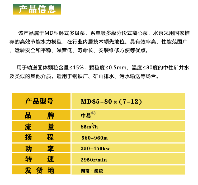 产品简介:MD型多级离心泵: MD型矿用耐磨多级离心泵是一种卧式单吸多级离心泵,采用了国家推荐使用的高效节能产品的水力模型,在行业内居于技术先进地位。具有效率高、性能范围广、运转安全和平稳、噪音低、寿命长:安装维修方便等优点。该类型的矿用多级离心泵是用于供输送固体颗粒含量不大于1.5%的中性矿水(粒度小..