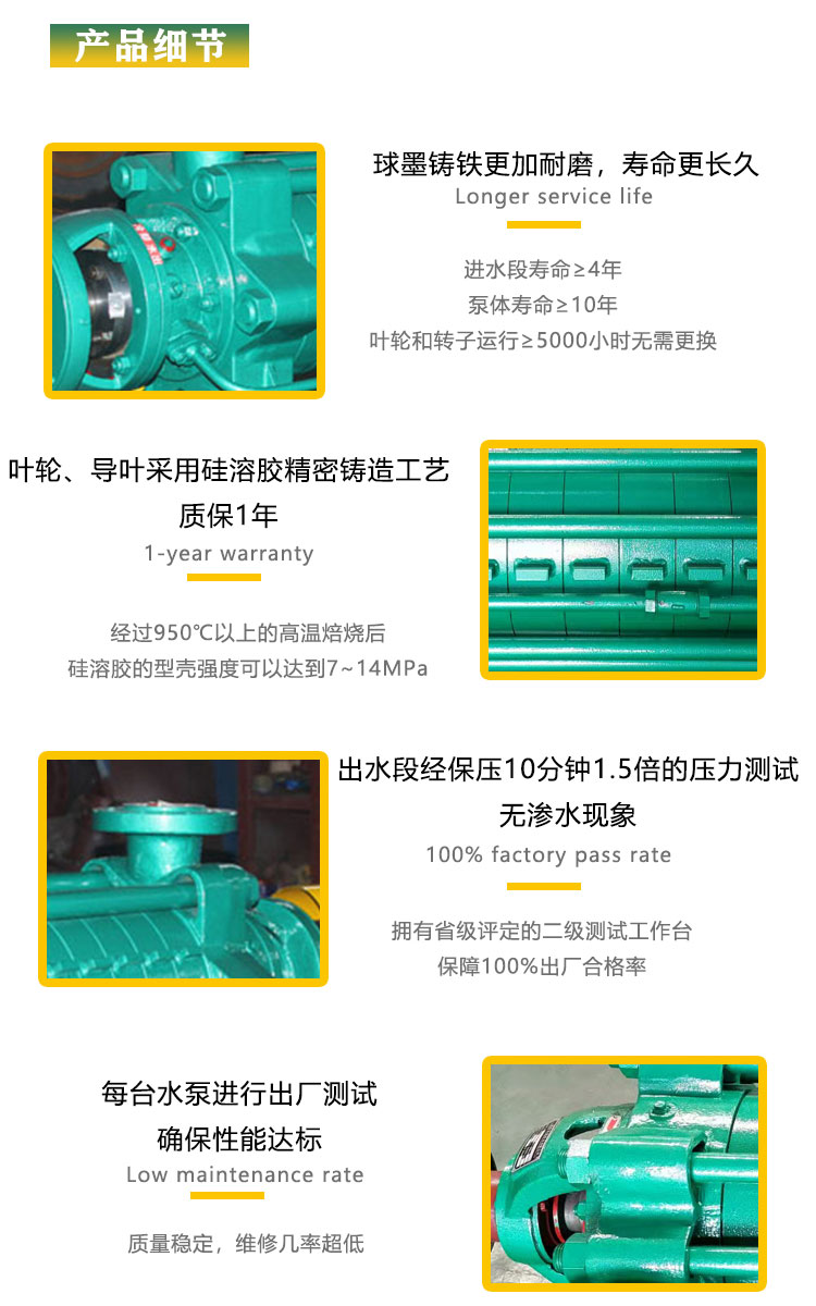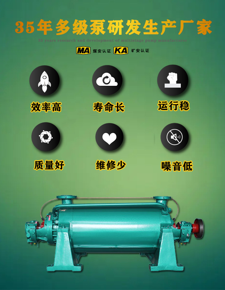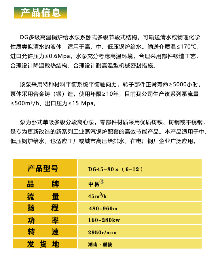 产品简介:DG锅炉给水泵: DG型多级锅炉给水泵为卧式多级单吸节段式离心泵,适于输送温度不高于250°C的清水,或物理化学性质类似于水的无腐蚀性的液体,广泛用于电厂、冶金、供暖等行业的锅炉给水,最高扬程可达1500米。