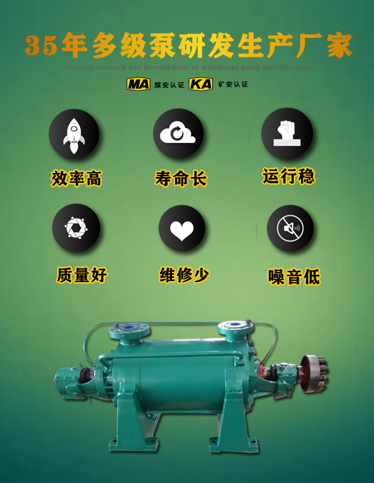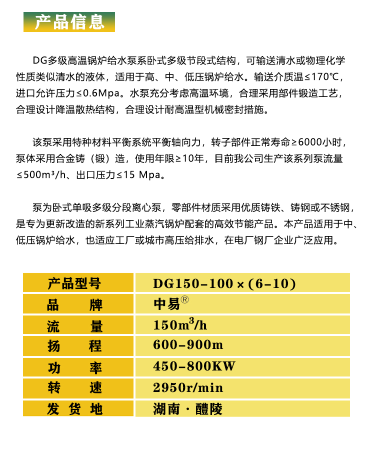 产品简介:DG锅炉给水泵: DG型多级锅炉给水泵为卧式多级单吸节段式离心泵,适于输送温度不高于150°C的清水,或物理化学性质类似于水的无腐蚀性的液体,广泛用于电厂、冶金、供暖等行业的锅炉给水,最高扬程可达1500米。