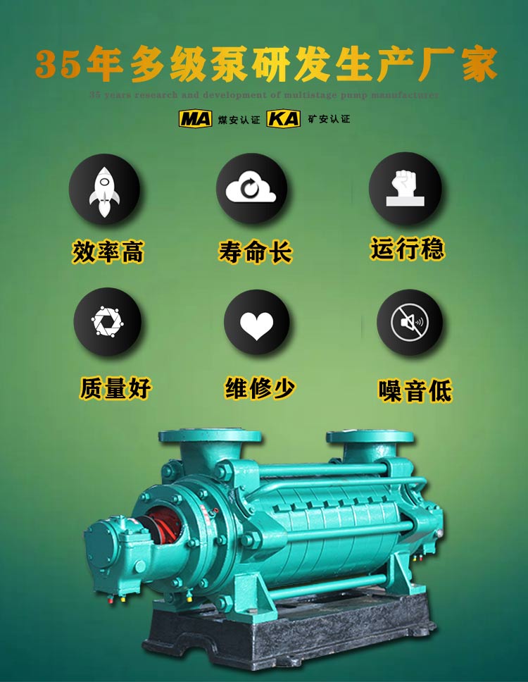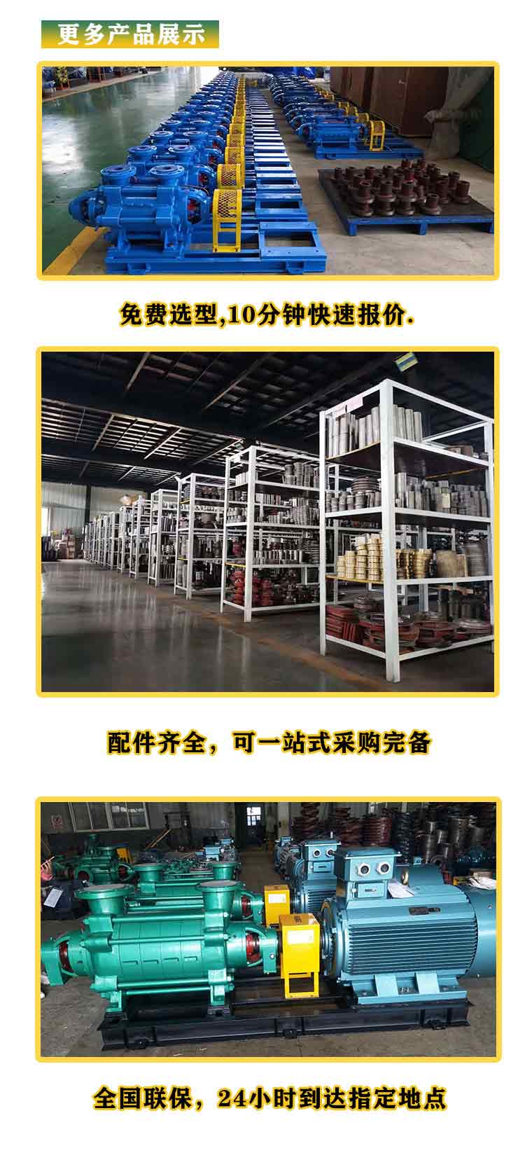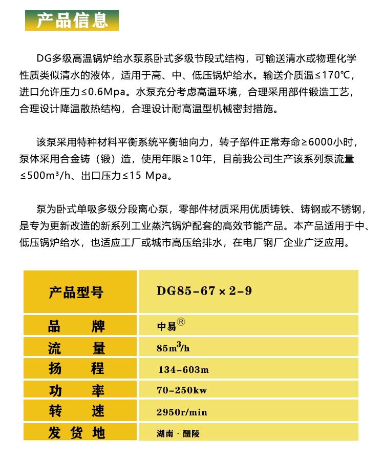 产品简介:DG锅炉给水泵: DG型多级锅炉给水泵为卧式多级单吸节段式离心泵,适于输送温度不高于150°C的清水,或物理化学性质类似于水的无腐蚀性的液体,广泛用于电厂、冶金、供暖等行业的锅炉给水,最高扬程可达1500米。
