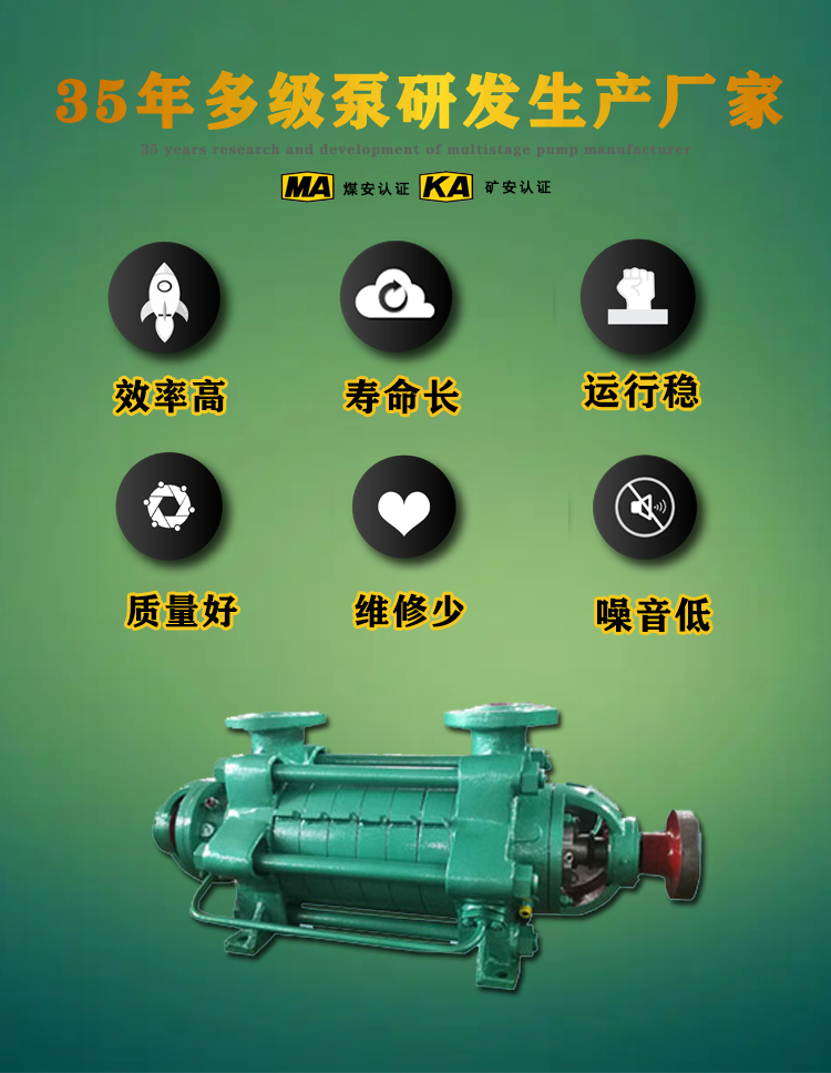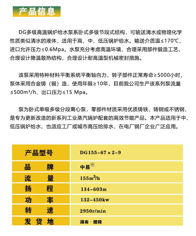 产品简介:DG锅炉给水泵: DG型多级锅炉给水泵为卧式多级单吸节段式离心泵,适于输送温度不高于150°C的清水,或物理化学性质类似于水的无腐蚀性的液体,广泛用于电厂、冶金、供暖等行业的锅炉给水,最高扬程可达1500米。
