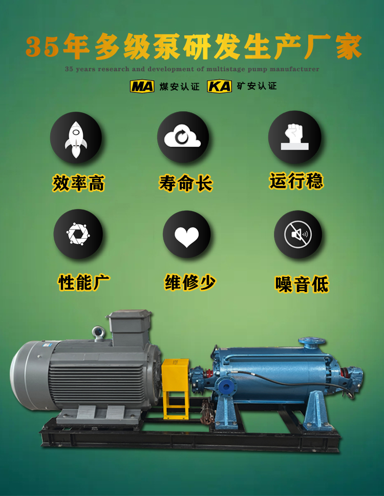该类型的矿用多级离心泵是用于供输送固体颗粒含量不大于1.5%的中性矿水(粒度小于0.5毫米)及类似的其他污水,被输送介质的温度不大于80℃,适用于钢铁厂、矿山排水、污水输送等场合。