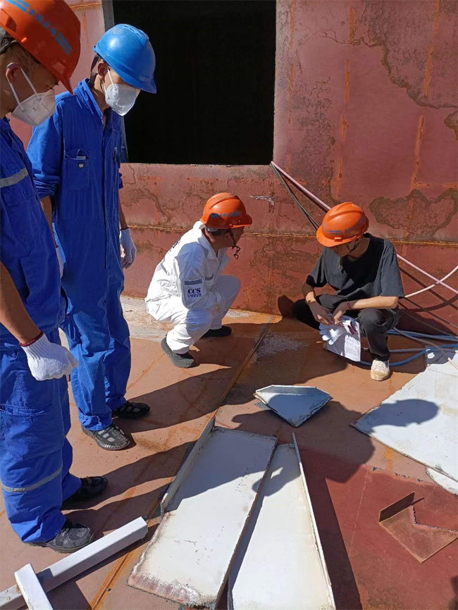 此次检验,CCS的船检人员深入到了船舱内部,进行了舱内结构焊缝、对接焊缝的无损检测,船检人员还对轮机管系 舱底泵与消防泵、甲板焊缝进行了检验。