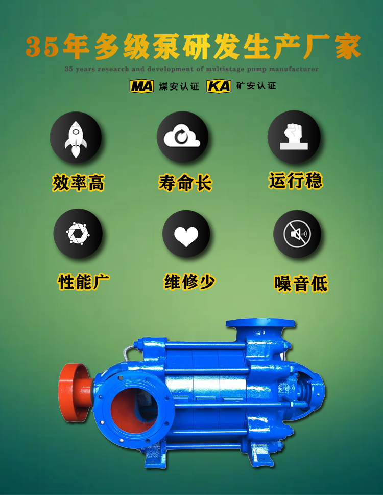 产品简介:MD型多级离心泵: MD型矿用耐磨多级离心泵是一种卧式单吸多级离心泵,采用了国家推荐使用的高效节能产品的水力模型,在行业内居于技术先进地位。具有效率高、性能范围广、运转安全和平稳、噪音低、寿命长:安装维修方便等优点。该类型的矿用多级离心泵是用于供输送固体颗粒含量不大于1.5%的中性矿水。