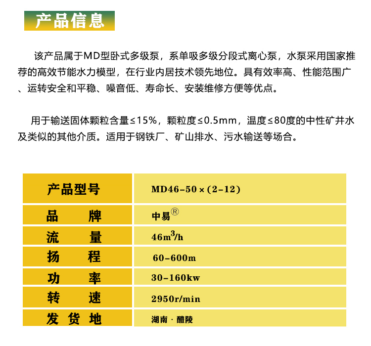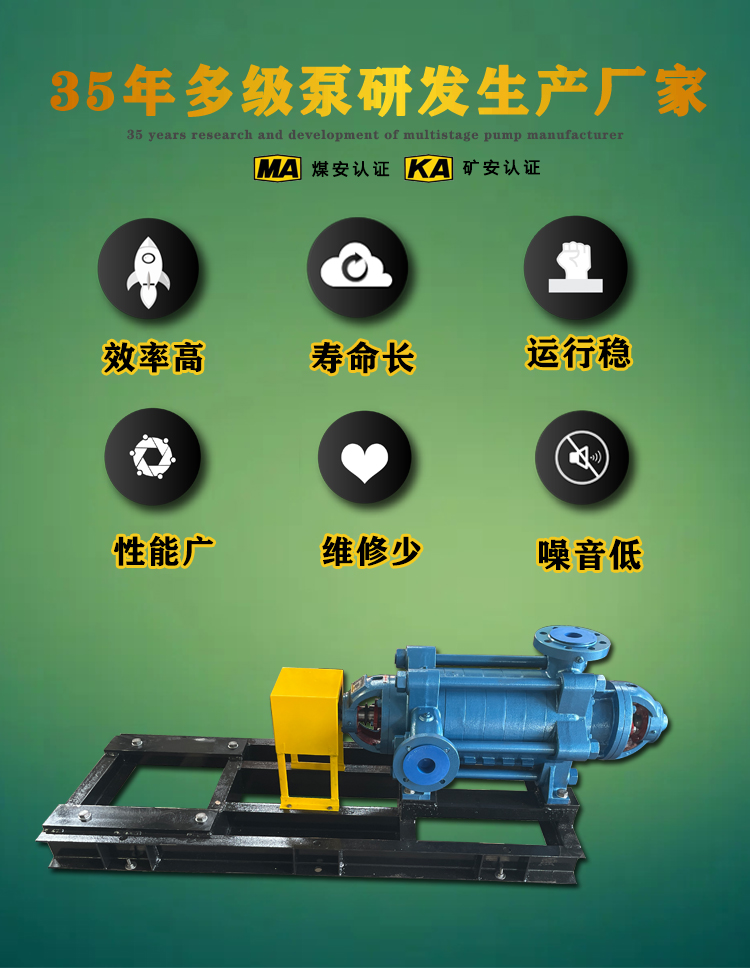 产品简介:MD型多级离心泵: MD型矿用耐磨多级离心泵是一种卧式单吸多级离心泵,采用了国家推荐使用的高效节能产品的水力模型,在行业内居于技术先进地位。具有效率高、性能范围广、运转安全和平稳、噪音低、寿命长:安装维修方便等优点。该类型的矿用多级离心泵是用于供输送固体颗粒含量不大于1.5%的中性矿水(粒度小..