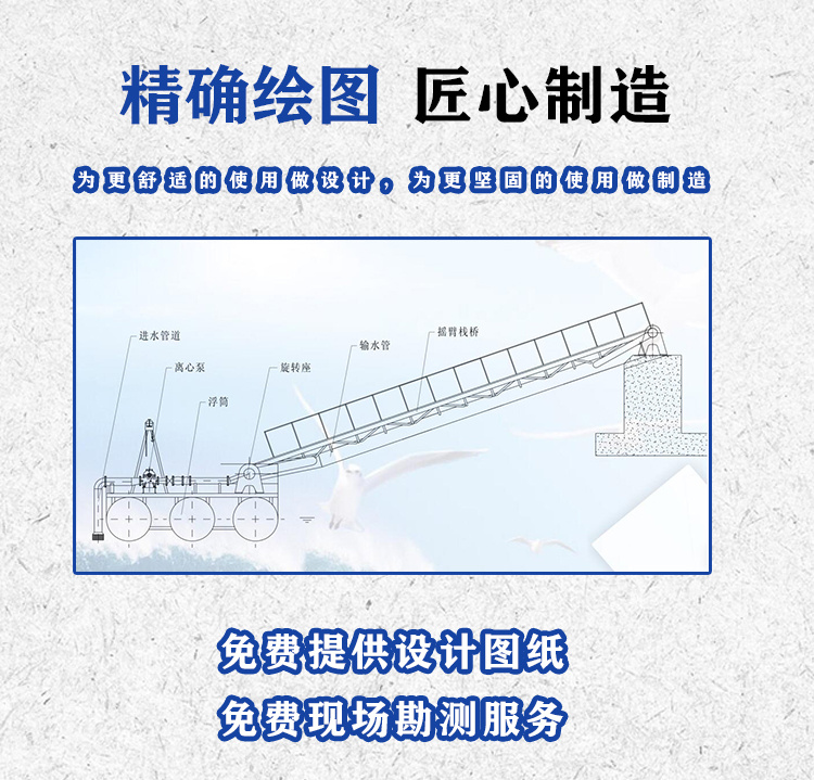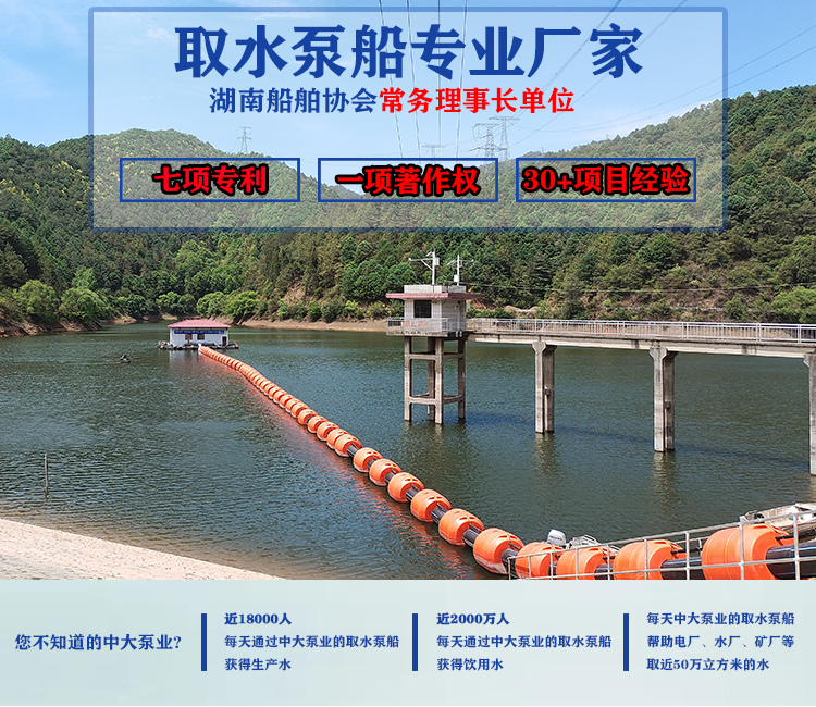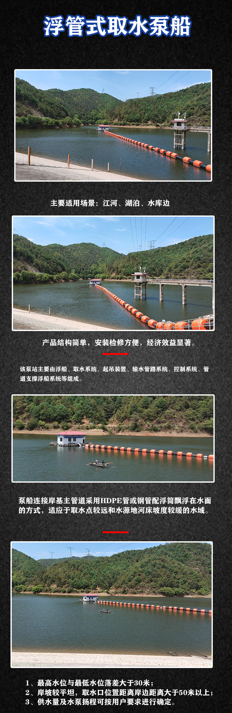 产品简介:浮管式取水泵船连接岸基主管道采用HDPE管或钢管配浮筒飘浮在水面的方式,适应于取水点较远和水源地河床坡度较缓的水域。