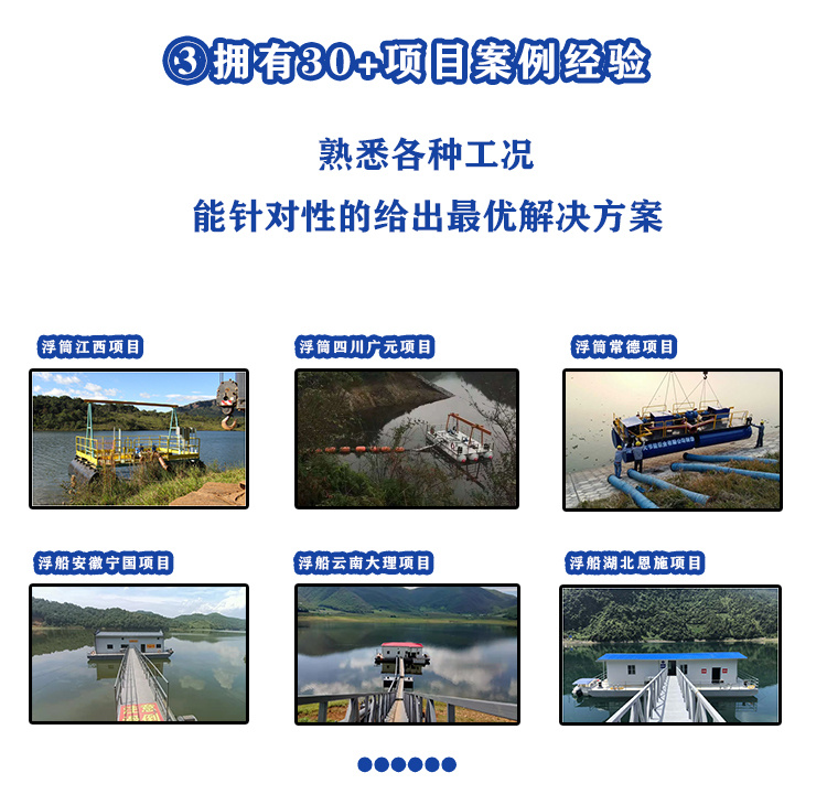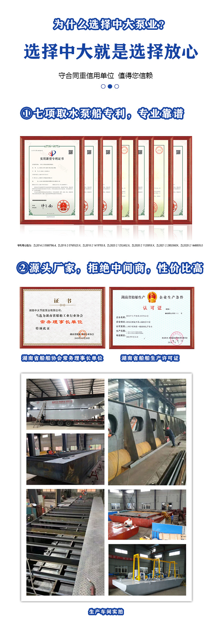 1、取水浮船采用拼装组合方式连接,使制作、运输和安装方便快捷,能满足各种取水量大小的需求:取水系统根据取水量大小、扬程高低,采取先进的真空自吸方式,节能型变频高低压电机配套双吸离心泵组成。