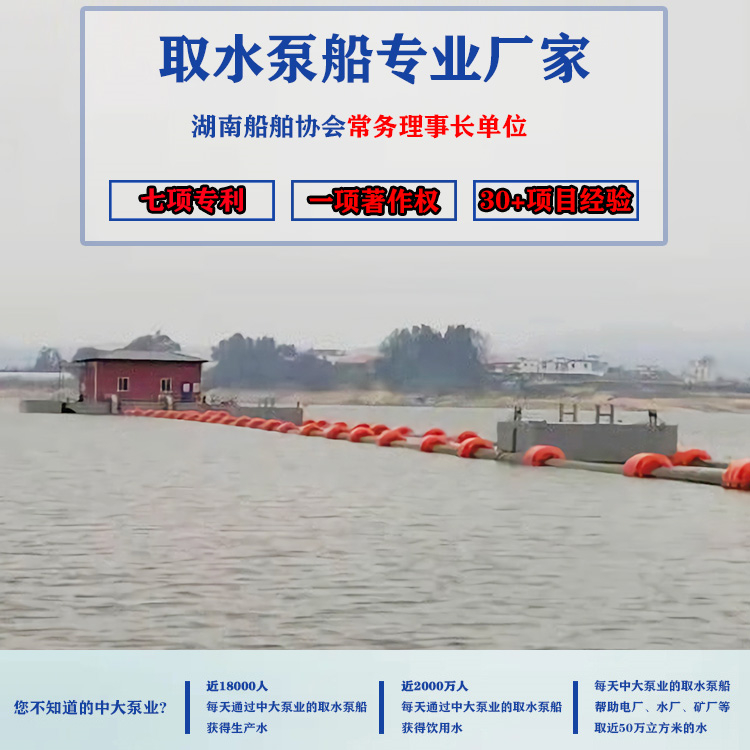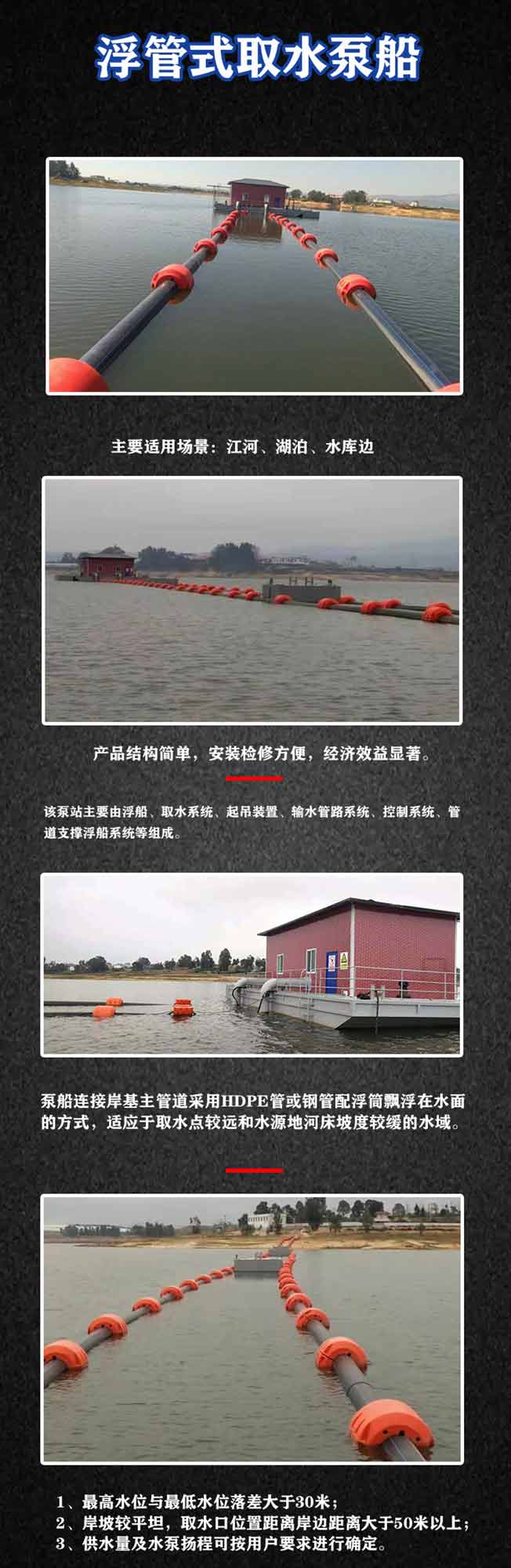产品简介:泵船连接岸基主管道采用HDPE管或钢管配浮筒飘浮在水面的方式,适应于取水点较远和水源地河床坡度较缓的水域。目前公司项目最长浮管长度800米。