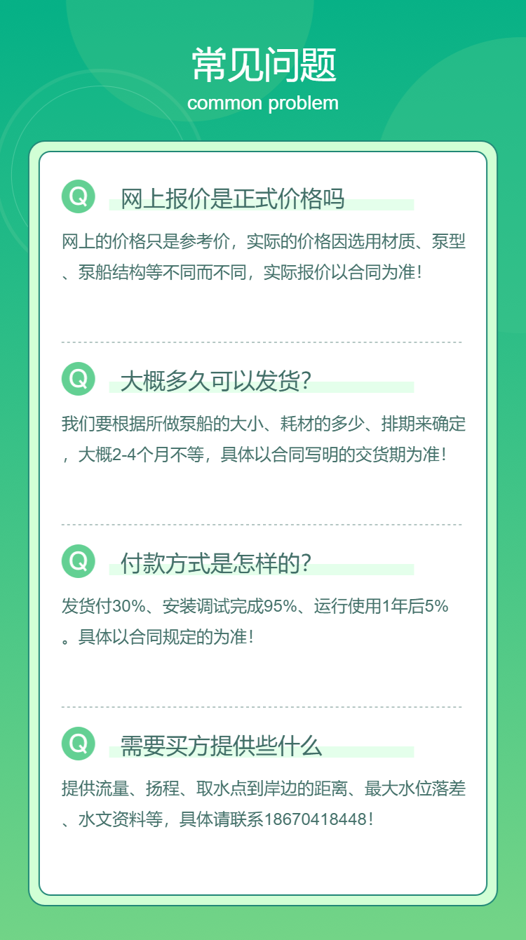 我公司是生产各类水泵及泵船的专业厂家,以其独特的专业技术占领市场,为用户提供满意合格的产品,实行终身服务是我公司的服务宗旨。我方将采取保本微利的原则,按IS09001国际质量管理体系为贵方提供好的服务。为此,我公司在此作以下承诺: