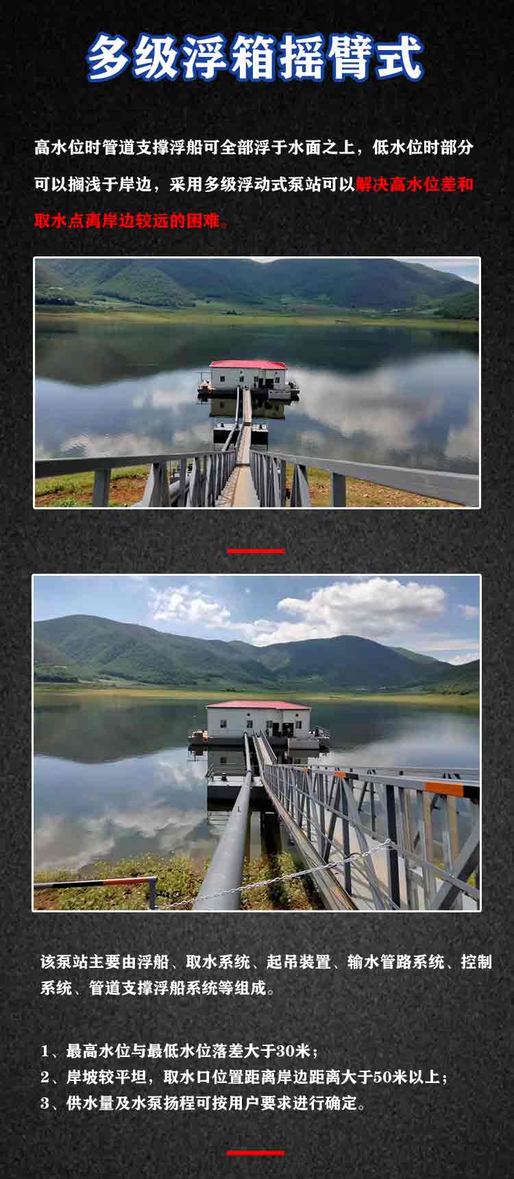 产品简介:多级浮箱摇臂式取水泵船高水位时管道支撑浮船可全部浮于水面之上,低水位时部分可以搁浅于岸边,采用多级浮动式泵站可以解决高水位差和取水点离岸边较远的困难。