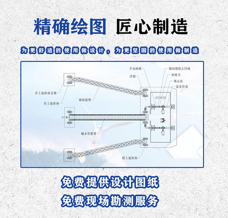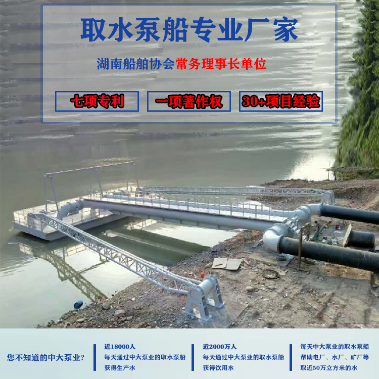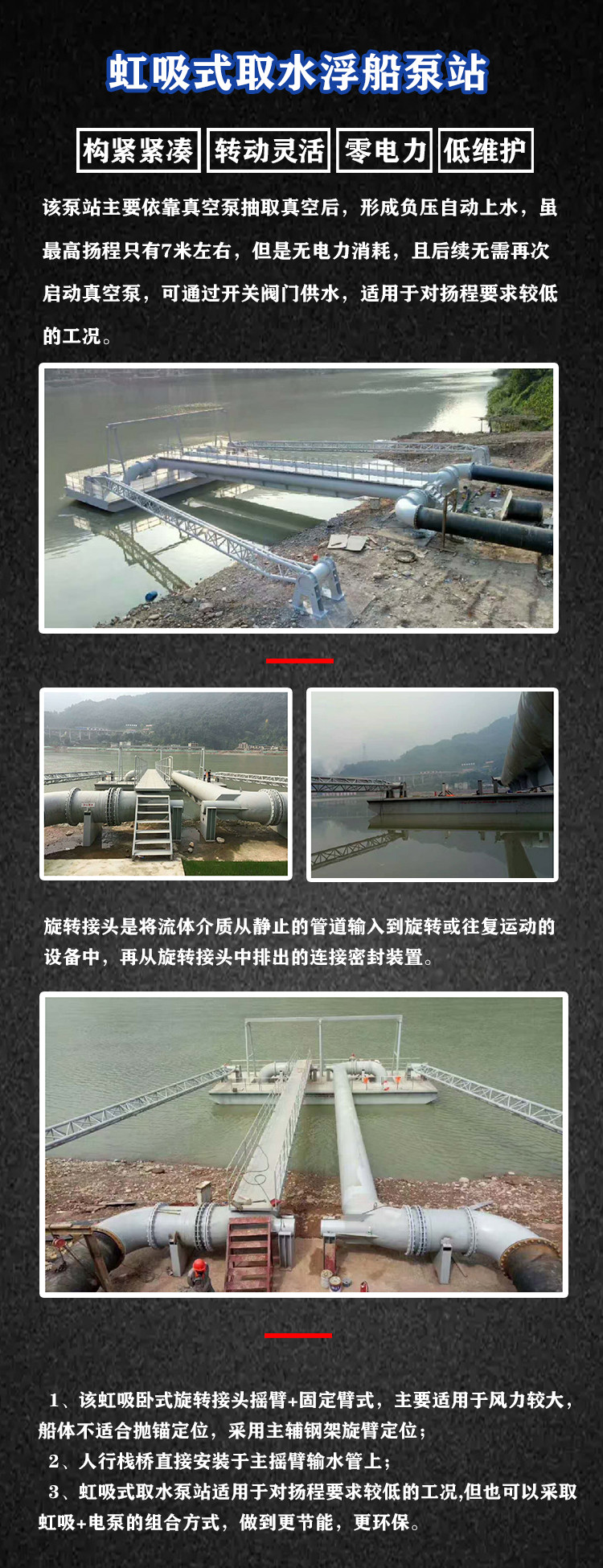 产品简介:虹吸式取水浮船主要依靠真空泵抽取真空后,形成负压自动上水,虽 最高扬程只有7米左右,但是无电力消耗,且后续无需再次 启动真空泵,可通过开关阀门供水,适用于对扬程要求较低 的工况。但也可以采取虹吸+电泵的组合方式,做到更节能,更环保。