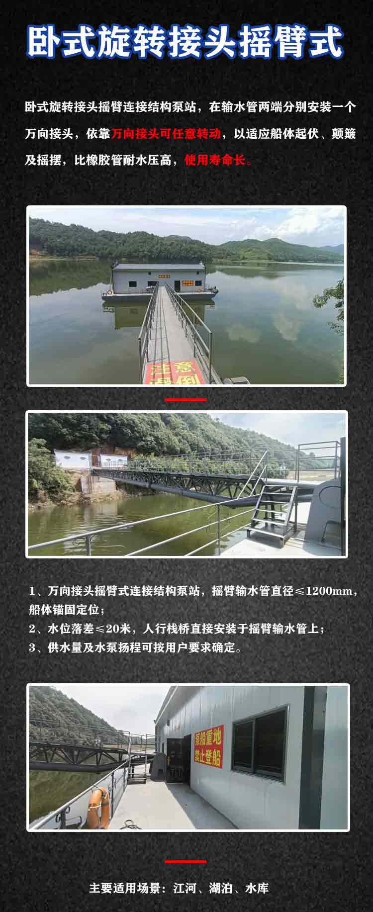 产品简介:卧式旋转接头摇臂连接结构泵站,在输水管两端分别安装一个万向接头,依靠万向接头可任意转动,以适应船体起伏、颠簸及摇摆,比橡胶管耐水压高,使用寿命长。