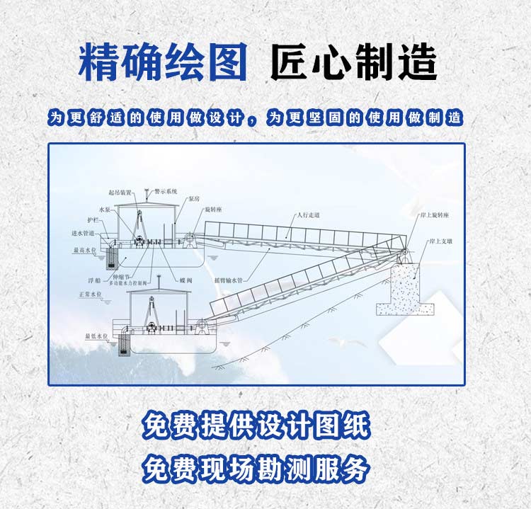 摇臂连接结构泵站主要包括:浮船、取水泵、阀门、供水管道、起吊检修装置、摇臂基座、摇臂输水管、栈桥、真空系统、消防系统、照明系统、警示系统、救生系统、锚固系统、电气控制系统、等构成,浮动泵站可采用PLC全自动控制及手动控制,水泵启停操作简单,运行安全可靠。
