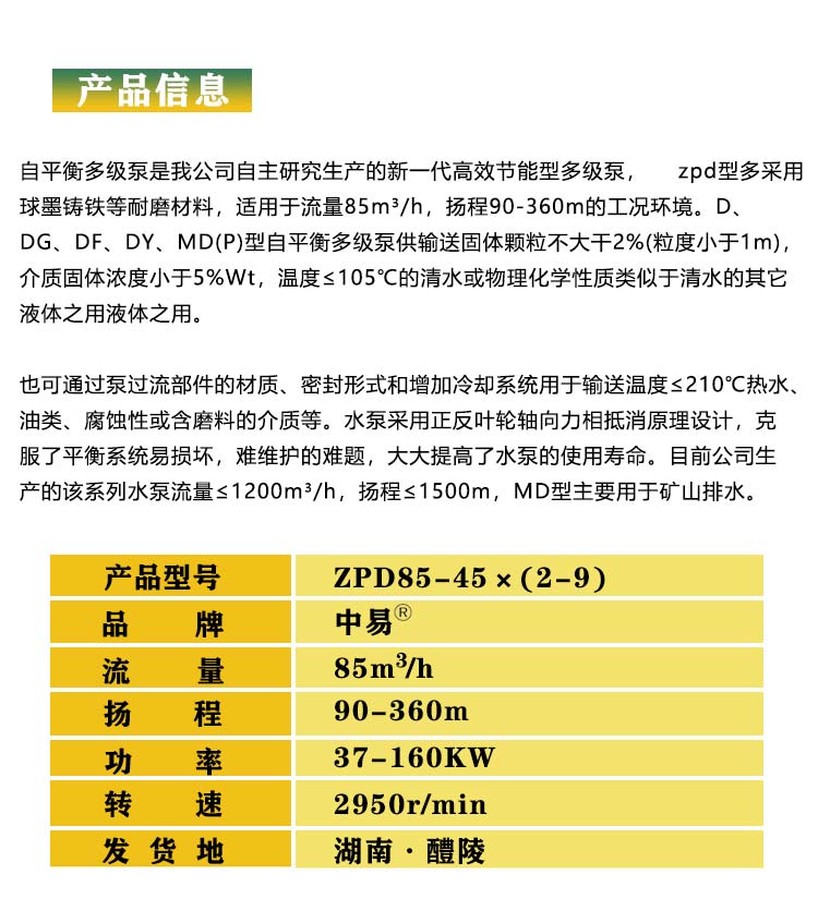 产品简介:自平衡多级离心泵: 自平衡多级泵是为满足用户需要,加速高压多级泵技术发展,采用国外同类产品的先进技术结合本公司多年设计经验,使用国家推荐的高效节能产品的水力模型,依据API610标准研究开发的高效高压多级离心泵产品;在行业内居于技术先进地位。具有高效区宽、性能范围广、汽蚀性能好、运转安全和..