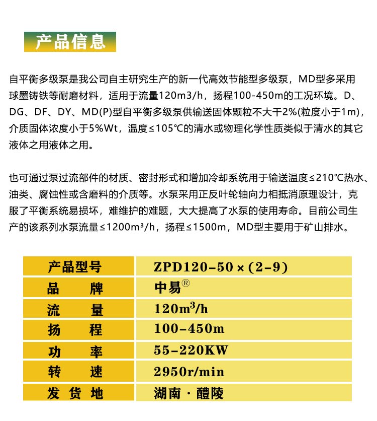 产品简介:自平衡多级离心泵: 自平衡多级泵是为满足用户需要,加速高压多级泵技术发展,采用国外同类产品的先进技术结合本公司多年设计经验,使用国家推荐的高效节能产品的水力模型,依据API610标准研究开发的高效高压多级离心泵产品;在行业内居于技术先进地位。具有高效区宽、性能范围广、汽蚀性能好、运转安全和..
